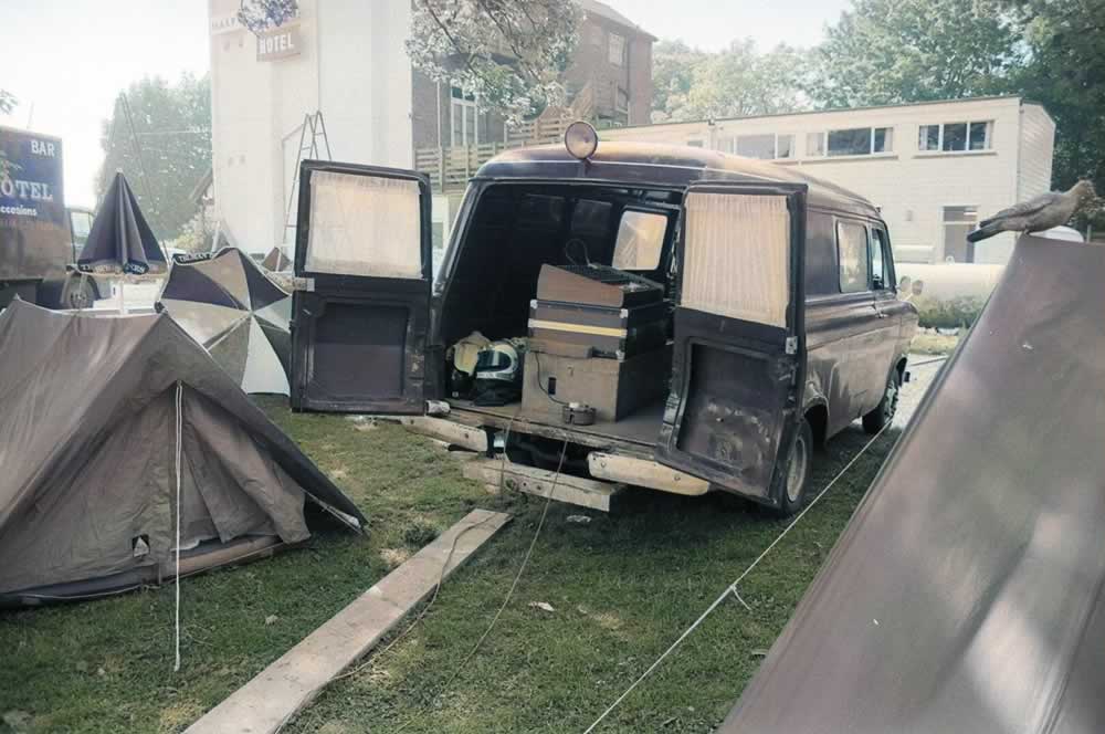 The back of our van - Wallace - with the FAL desk on top of its flight case.
