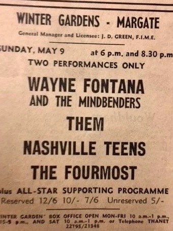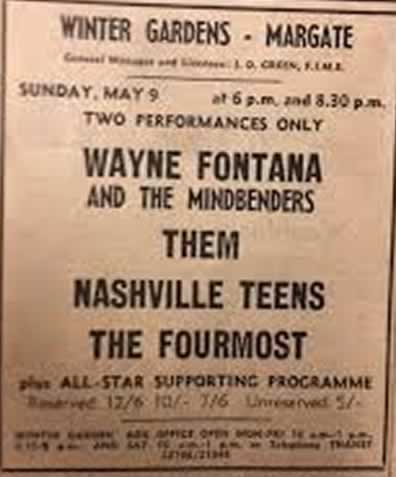 - Sunday, May 9, 1965: Wayne Fontana and the Mindbenders, Them, The Nashville Teens, The Fourmost plus support, two shows at 6pm and 8.30pm