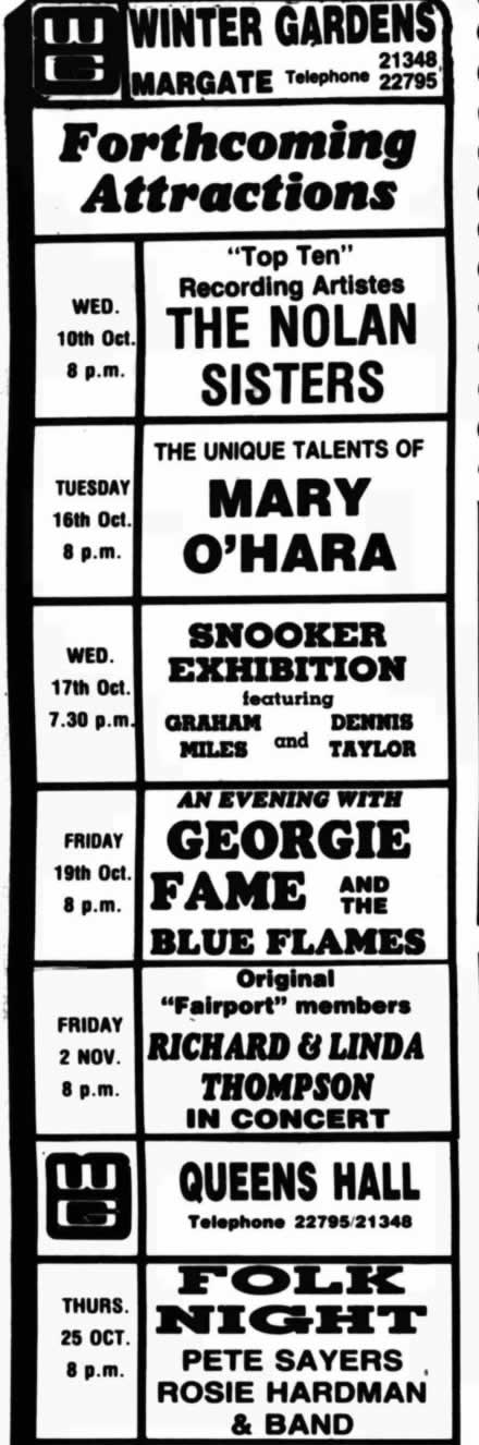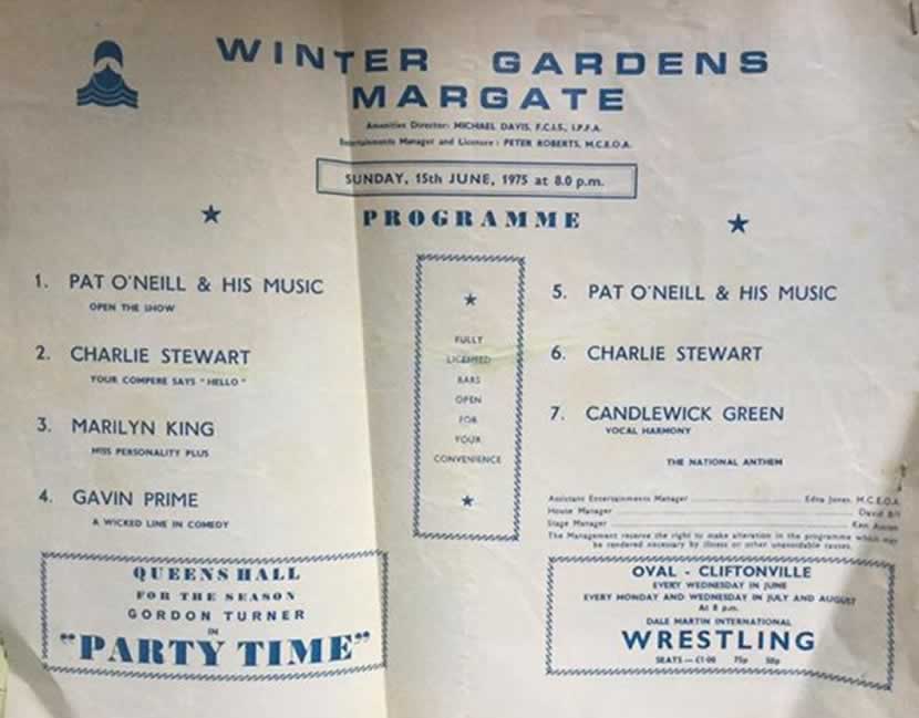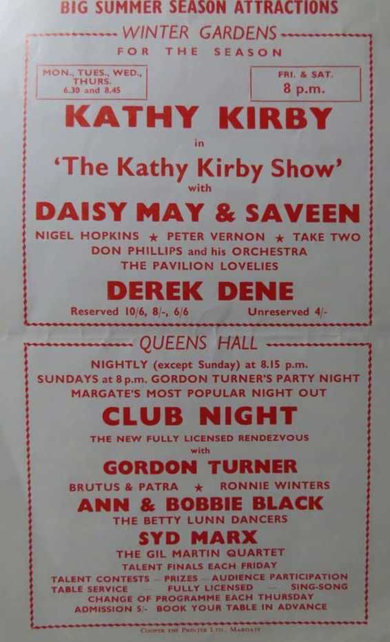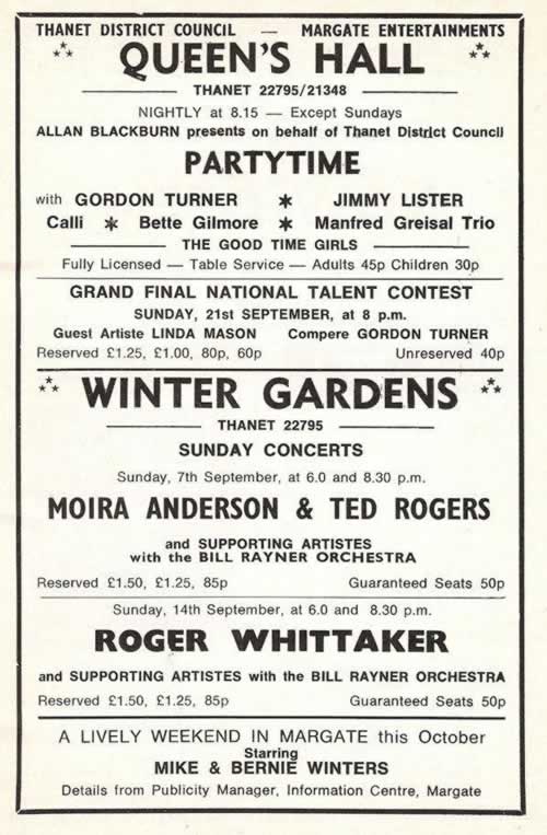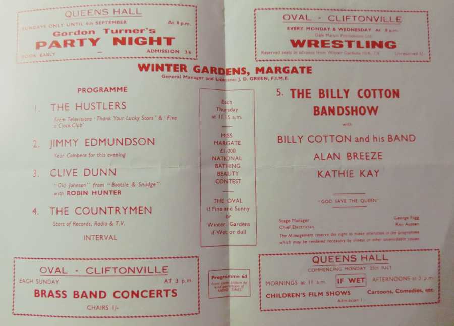 - Advertised as Winter Gardens - Margate General Manager and Licensee : J. D. Green Sunday, 25th June At 8 p.m. Petula Clark And Bumper Variety Bill Reserved 7/6, 6/-, 4/6 ; unreserved 3/-.