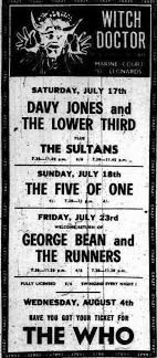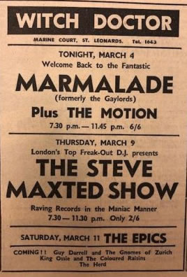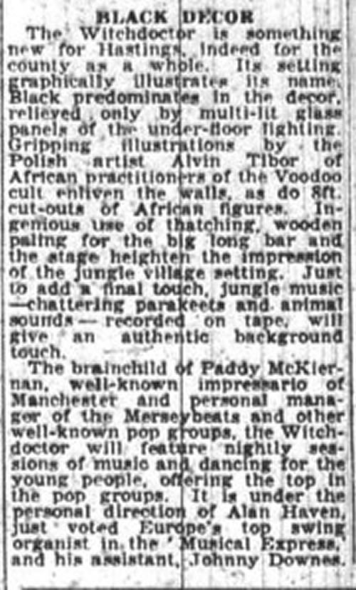 The Witch Doctor at The Dolphin, Marine Court, St. Leonards, Hastings, East Sussex opened on Saturday, July 17, 1964 with The Nashville Teens and Buddy Britton and the Regents from 7.30pm to 11.30pm.