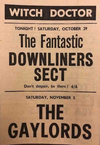 The Manger of The Witch Doctor was Johnny Downes (b. John Downes, 1942, North Wales). At 17 he had joined a group called The Dolphins and worked with them for two and a half years. It seems on Saturday, September 29, 1962 The Dolphins backed singer Johnny Downes which was advertised in The Manchester Evening News of Friday, September 28, 1962 as